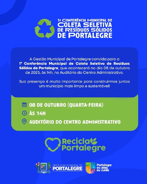 A Gestão Municipal de Portalegre convida para a 1ª Conferência Municipal de Coleta Seletiva de Resíduos Sólidos de Portalegre, que acontecerá no dia 08 de outubro de 2025, às 14h, no Auditório do Centro Administrativo.