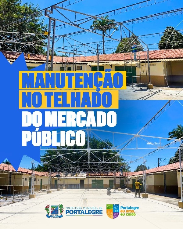 Está sendo realizada a manutenção da cobertura do salão do Mercado Público, com serviços em toda a estrutura metálica e substituição das telhas.