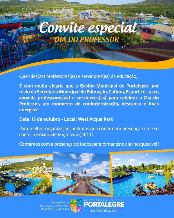 É com muita alegria que a Gestão Municipal de Portalegre, por meio da Secretaria Municipal de Educação, Cultura, Esporte e Lazer, convida professores(as) e servidores(as) para celebrar o Dia do Professor, um momento de confraternização, descanso e boas energias!