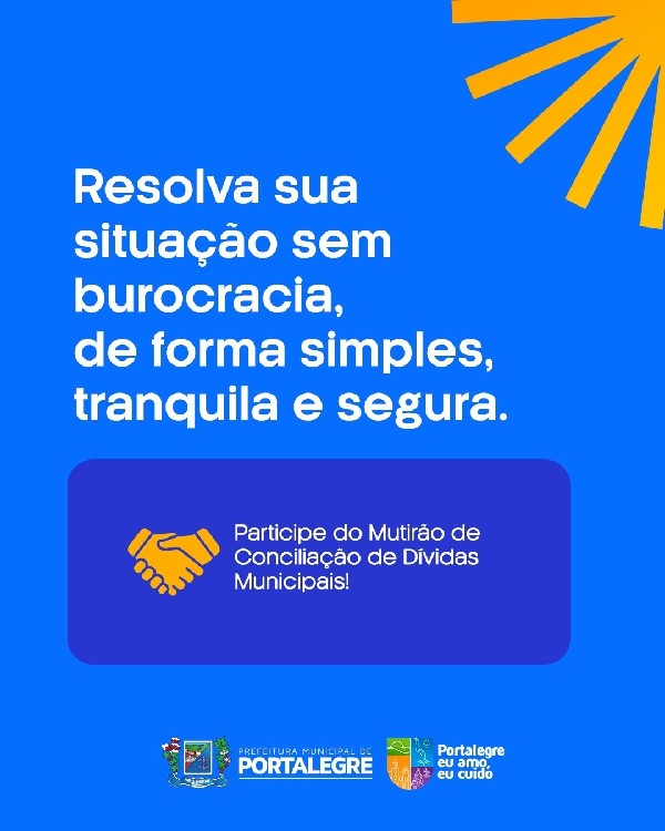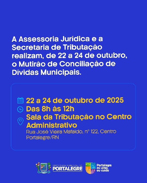 A Assessoria Jurídica e a Secretaria de Tributação de Portalegre convidam os contribuintes com débitos inscritos na Dívida Ativa Municipal a participarem do Mutirão de Conciliação de Dívidas, que acontecerá de 22 a 24 de outubro, na Sala da Tributação da Prefeitura.